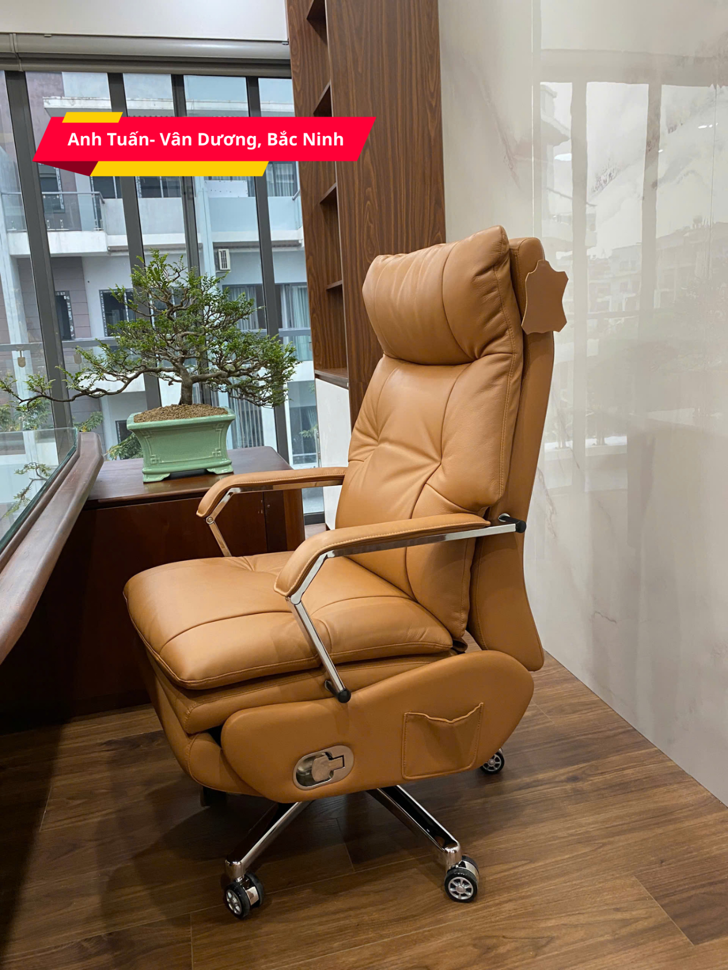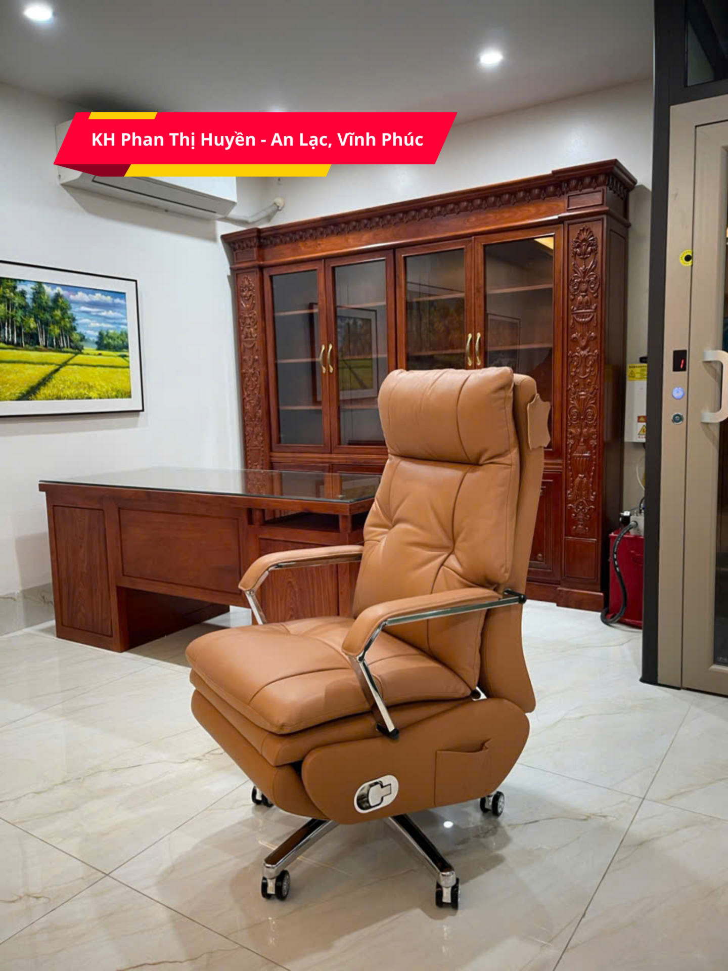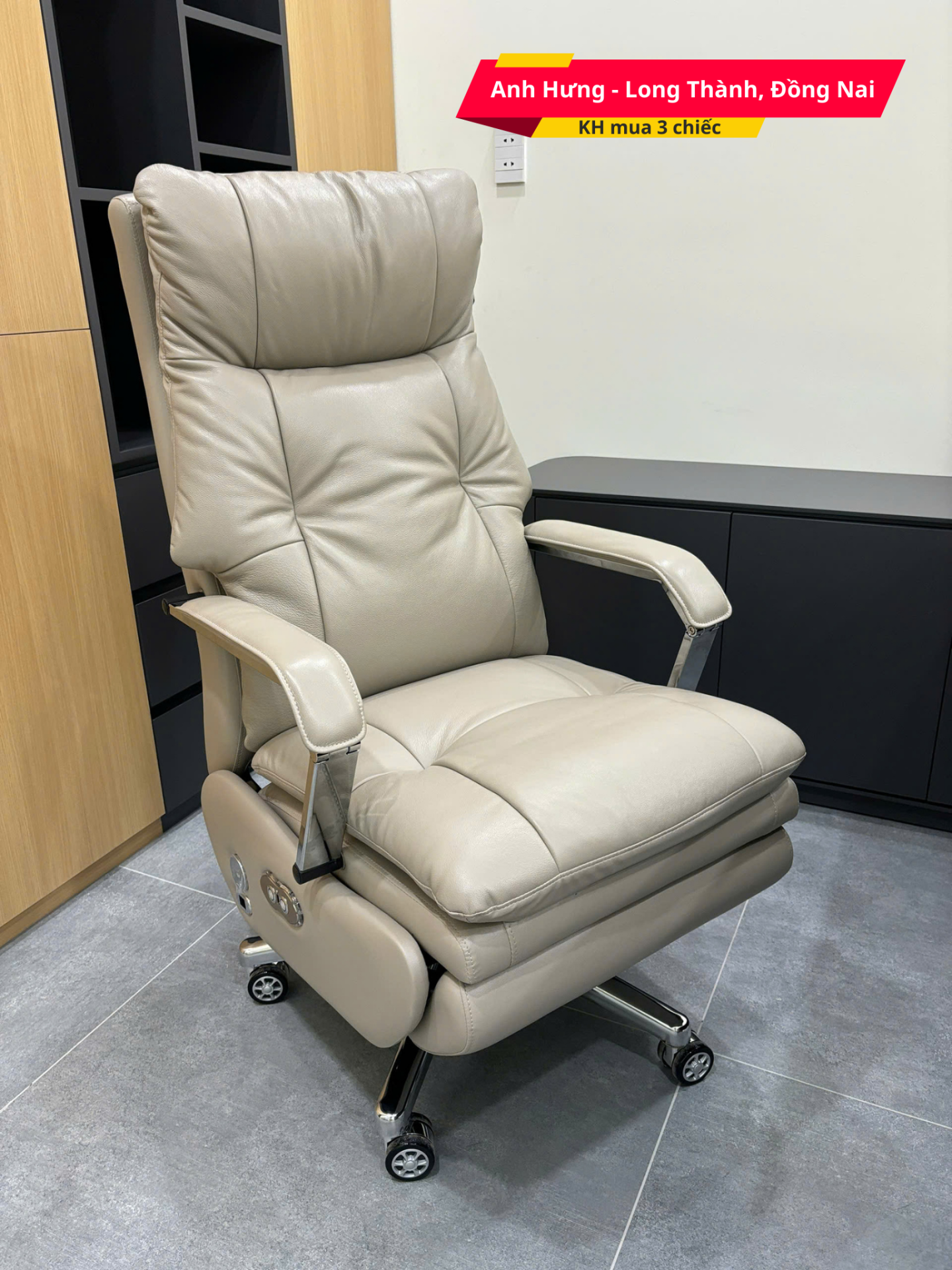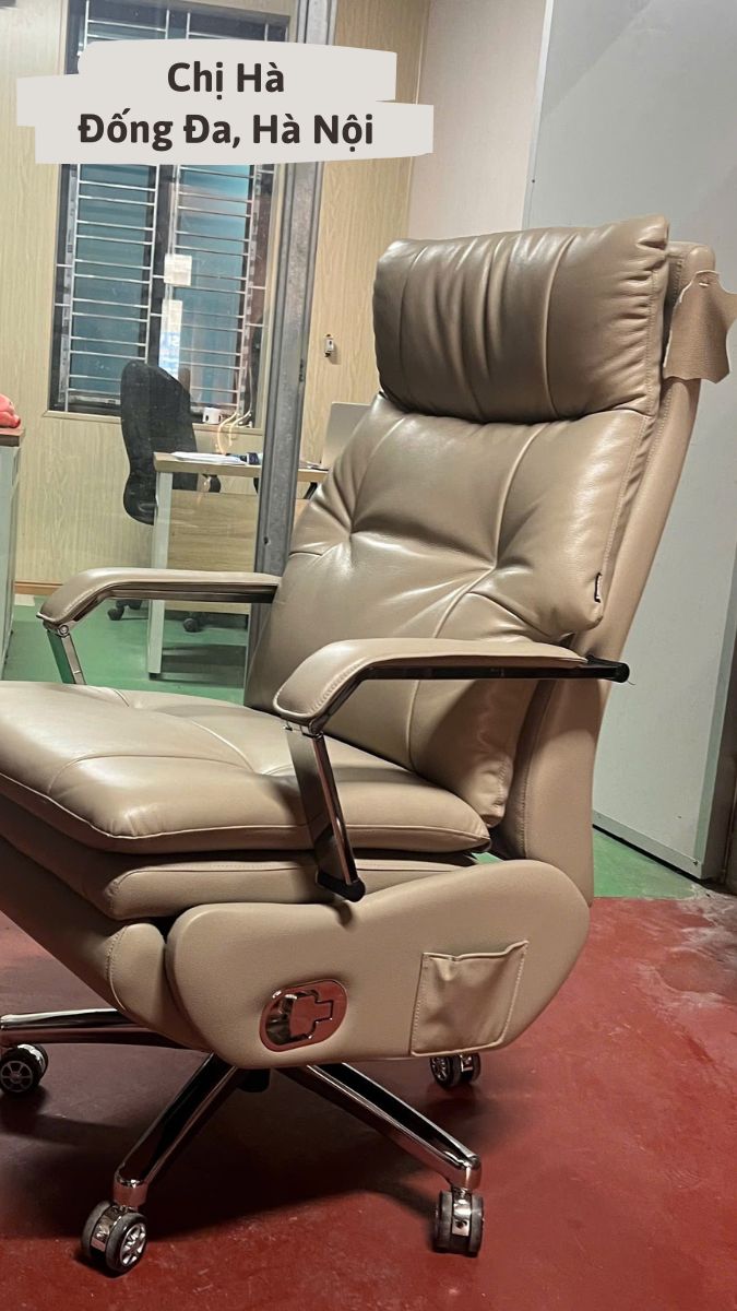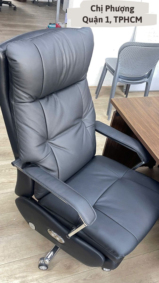 - Chất liệu: Da bò nguyên tấm - Top Grain, đệm mút và bông Cotton cao cấp. Tay vịn, chân ghế bằng hợp kim mạ điện